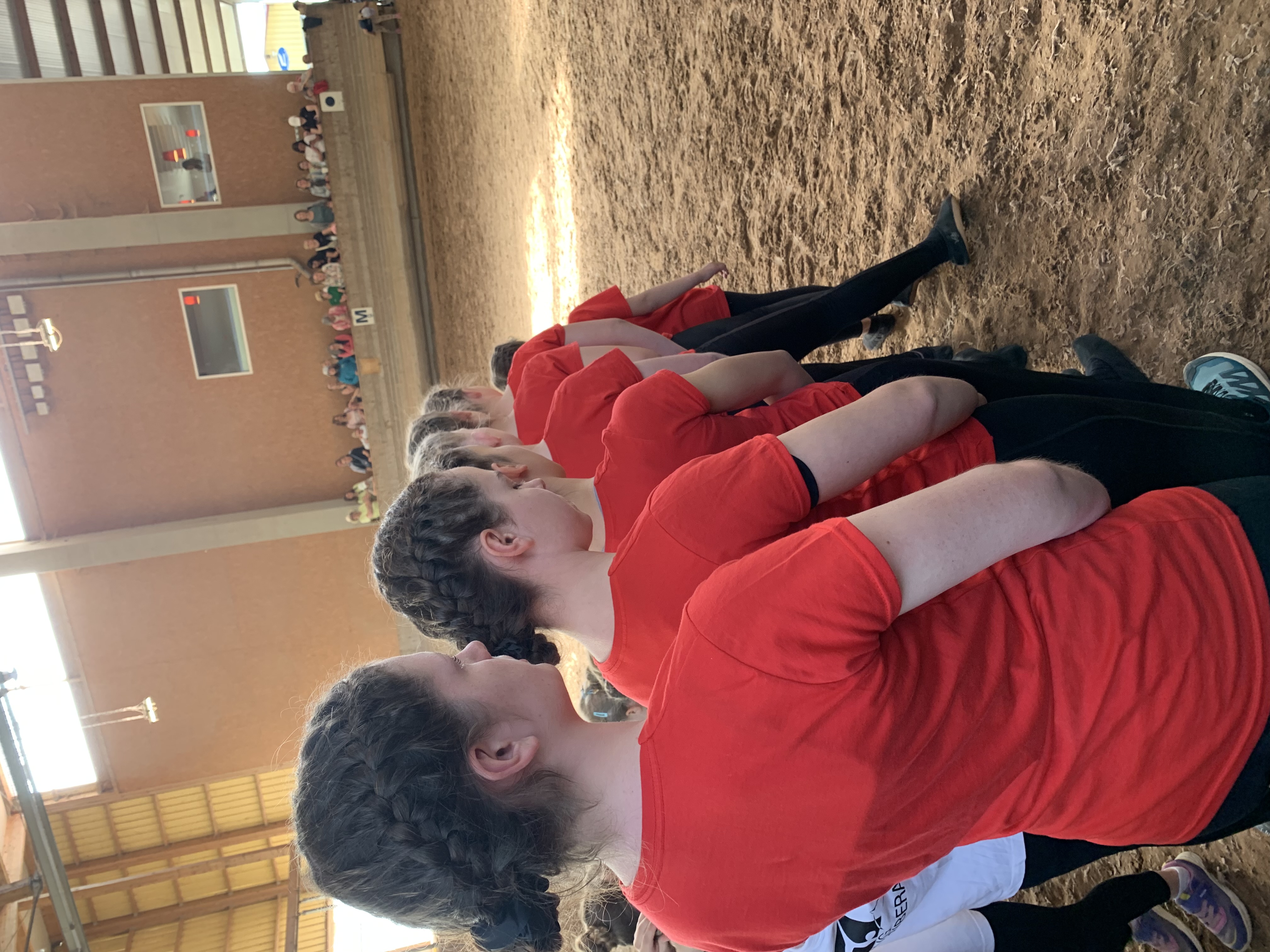 Vom Trab zurück in einen geordneten Schritt entwickelte sich eine saubere, harmonische und sehenswerte Performance. Auch das Auslaufen klappte einwandfrei, und Pferd, Longenführerin, Volti‑Helferin und Voltigiererinnen (Elisa, Ida, Emma, Jana, Andrina, Silvia, Miriam) machten gemeinsam eine richtig gute Figur. Belohnung für Dusty: Gras snacken, Hänger, ab nach Hause – Job erfüllt!