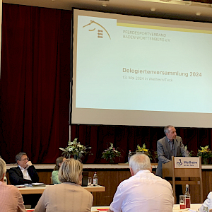 Ab 16:30 Uhr startete die Delegiertenversammlung mit der formalen Tagesordnung: die Begrüßung sowie die Frage nach weiteren Anträgen, zur Beschlussfähigkeit und den Bericht über das Geschäftsjahr 2023 übernahm der Präsident des Landesverbandes Baden-Württemberg, Klaus Dieterich. Er berichtete zum Geschäftsjahr 2023 und. Den Sorgen in Sachen Mitgliederentwicklung im Reitsport, obwohl hier Baden-Württemberg noch positiv abschließt. Sowie Maßnahmen zur Beratung defizitäre Betriebe, die ihren Schulbetrieb schließen wollen, sowie Unterstützungsmaßnahmen für Schulpferde. Danach folgten die Kurzberichte aus den Disziplinenausschüssen. Gestartet wurde mit der Dressur und Christoph Niemann, es folgten Springen, Jürgen Kurz, Vielseitigkeit, Dr. Helmut Mett (in Anwesenheit trug hier Miriam Abel vor), Ponysport, Heinz Bürk, Voltigieren, wie immer sehr engagiert und mitreißend, Solveig Blankenhorn, Vierkampf, Iris Keller und für die Landesjugendarbeit Petra Schubert. Es folgte die Jahresabrechnung 2023, vorgetragen von. Schatzmeister des Landesverbandes Ole Christoph Gunzenhäuser. Hier wurde gezeigt, wie gutes Wirtschaften geht und vor allen Dingen wie gutes „Reporting“ dazu erfolgt. Da kann sich die FN mal eine Scheibe abschneiden. Hier wurde souverän der Delegiertenversammlung Bericht erstattet, und zwar umfassend & detailliert. Eine professionelle Aufstellung war vorhanden und wurde erläutert: Vergleich von Plan zu Ist und die Vorjahressituation. Insgesamt schließt der Landesverband positiv ab mit einem Jahresergebnis von 98000€. Auch die Planung fürs kommende Jahr ist man vorausschauend vorsichtig. Risikobewusstsein mit der Bildung von Rückstellungen für die anstehenden Maßnahmen. Z.B. in der Nachwuchsgewinnung für den Breitensport (Festival) und für mögliche Großveranstaltungen ... Fragen gab es keine: eine runde Vorstellung. So bekundeten es auch die Kassenprüfer, Frau Heike Glück und Herr Nico Keller. Das Präsidium wurde einstimmig entlastet, die Kassenprüfer erneut einstimmig gewählt. Und auch der Haushaltsvoranschlag glänzte. Hinweis vom Kassier zu den gestiegenen FN-Mitgliedsbeiträgen mit 1.50 Euro pro Vereinsmitglied!