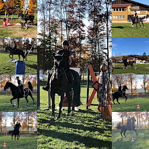 Eine schöne Abwechslung zum aktuellen Corona-Geschehen durften unsere Vereinsmitglieder Petra Kuhn und Wolfgang Herling am vergangenen Wochenende bei den Reiterkollegen des RFV Pfullendorf „kennenlernen“! Auf der vereinseignen Anlage fand der „Trailkurs / Working Equitation“ mit Andrea Stoller statt. Bei tollem Herbstwetter mit typischem Flair, sprich „All-In“ – Regen, Sonne, Wind und jede Menge Wetter – ging’s los in Zweiergruppen. Nach dem Aufwärmen hieß es „ran an die Halloween-Hindernisse“! Kürbis, Totenkopf und Hexe luden ein zu tollen Herausforderungen: die Anlage bot tolle Möglichkeiten und vielfältige Hindernisse, so daß für alle etwas dabei war. Der Spaßfaktor stand natürlich primär im Vordergrund - aber, Black Lady Maifee entpuppte sich zur Begeisterung der erfolgreichen Working Equitation-Coach Alex zum echten Hight Potential. Nicht nur, dass sie die Aufgabenstellung bei herausfordenden Bodenverhältnissen mit Bravour meisterte, spätestens am Tag 2 war sie ready-for-competition! Von daher war der Einsatz für unsere Vereinsmitglieder Petra und Wolfgang mit ihren Pferden Maifee und Roy- der erste Abstecher in die Disziplin der Working Equitation - mit Sicherheit nicht der letzte. Vom – auf den ersten Blick – einfachen Anreiten der einzelnen Hindernisse bzw. Aufgaben, erab sich die Herausforderung aus der Umsetzung bzw. dem Detail. Vorwärts rein – easy – aber dann alles wieder rückwärts raus – alles andere als easy!
