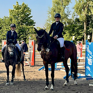 Weiter ging es Punkt 12 Uhr mit der Punktespringprüfung Kl A** mit Joker über 105 cm. Hier waren unsere Hannah-Sophie Mayer und Madlen Wolff an den Start gegangen. Hannah hatte ihren schicken Comte Canturo mitgebracht und die beiden meisterten die Klippen im Parcours hervorragend: in 59,67s waren sie mit 54 Punkten im Ziel. Madlen waren mit ihrem routinierten Cheppetto's Chip angetreten und ebenfalls mit 54 Punkten in 60,26s im Ziel. Für Hannah ein toller 10. Platz und für Madlen ein super 12. Platz. Congrats!