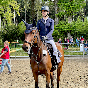 Es gibt kein schlechtes Wetter für echte Springreiter und damit startete Amazone Eva-Marie Brugger den Schleifenregen des Wochenendes mit ihren wilden Jungen am Freitag den 5.5. in Bad Schussenried. Passend zum Kreismeisterschaftsfeeling des PSK Biberach ging’s ambitioniert in der 1. Abteilung der Springpferdeprüfung Kl. A* mit ihrer beautiful Clarice Cooper an den start. Jump & fly war das Motto und die beiden segelten elegant mit Wertnote 8,1 auf Platz 4. Congratulations!