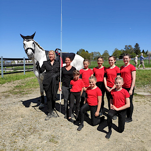 An den Start ging ein Mix‑Team aus Sportlerinnen der beiden RFVA‑Standorte Ailingen und Ahausen/Bermatingen, die sich erstmals gemeinsam auf Turnierparkett präsentierten. Als wäre das nicht schon spannend genug, gab es gleich zwei Premieren: Schimmel „Dusty“, neues Pferd aus dem Stall Ahausen, absolvierte nicht nur seinen ersten Einsatz für den RFVA – sondern überhaupt sein allererstes Voltigierturnier. Nervosität? Und wie!