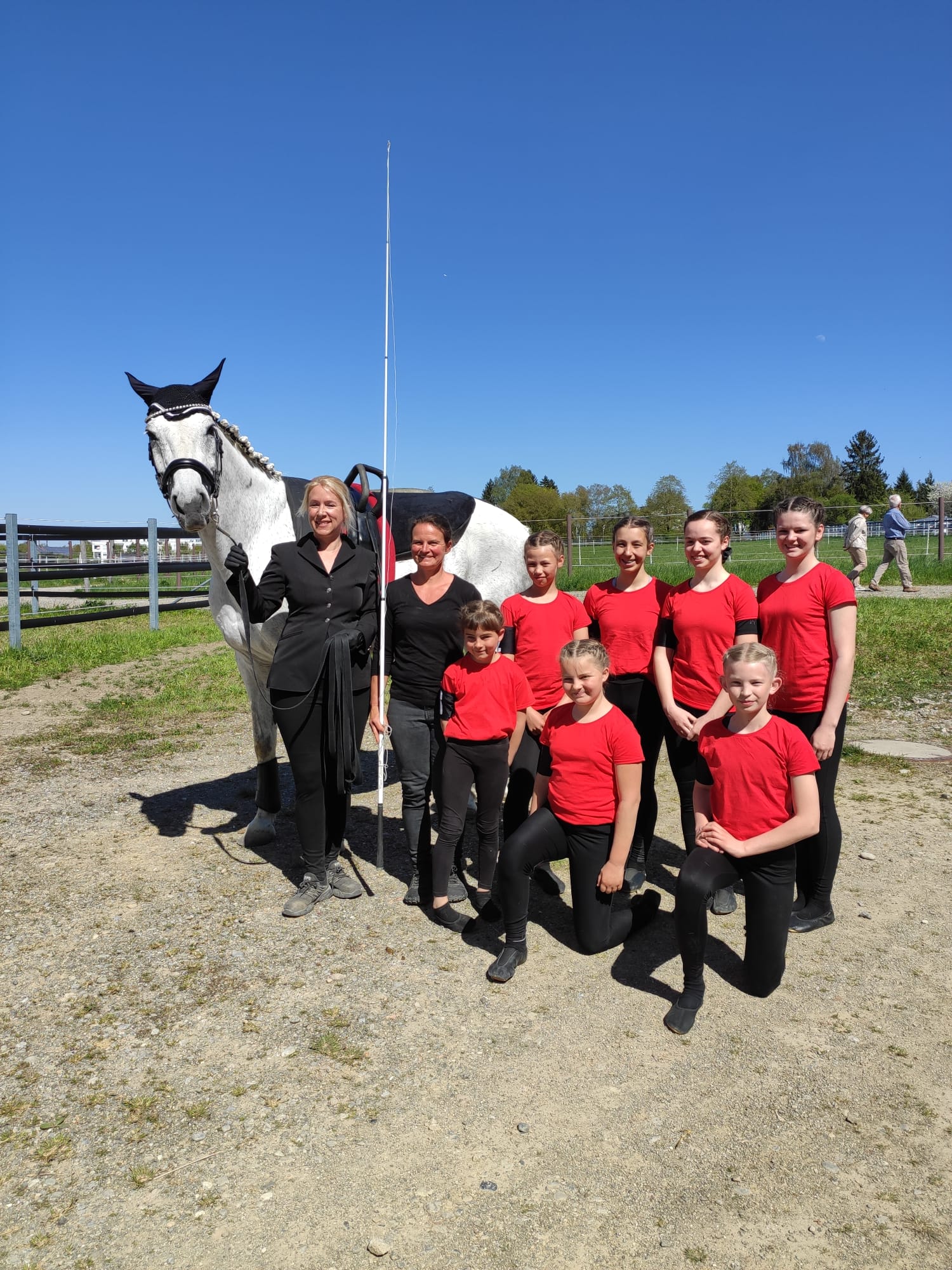 Vom Trab zurück in einen geordneten Schritt entwickelte sich eine saubere, harmonische und sehenswerte Performance. Auch das Auslaufen klappte einwandfrei, und Pferd, Longenführerin, Volti‑Helferin und Voltigiererinnen (Elisa, Ida, Emma, Jana, Andrina, Silvia, Miriam) machten gemeinsam eine richtig gute Figur. Belohnung für Dusty: Gras snacken, Hänger, ab nach Hause – Job erfüllt!