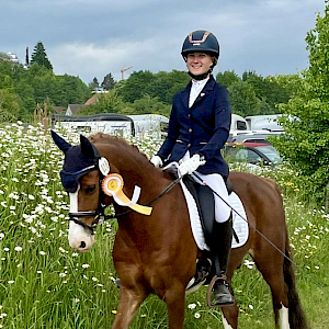 ... und am Samstag, den 17. Mai, ging es direkt um 12 Uhr in Wangen auf dem Dressurplatz weiter. Dorthin hatte unsere Clara Roggendorf ihren süßen Franklin mitgebracht, der ihr von Friederike Hack zur Verfügung gestellt wird. Die beiden starten in der Dressurprüfung der Klasse E und zeigten ihre Extraklasse. Die beiden tanzten sich durch die Aufgabenstellung ne posierten dann erfolgreich in der finalen Grußaufstellung - tolle Leistung! ...und so sahen es auch die Richter, vergaben hier die Wertnote von 7,8. Das war letztendlich Gold und unerreichbar für den Rest der ehrgeizigen Mannschaft. Wir gratulieren herzlichst zur ersten goldenen Schleife des tollen Wochenendes!