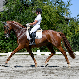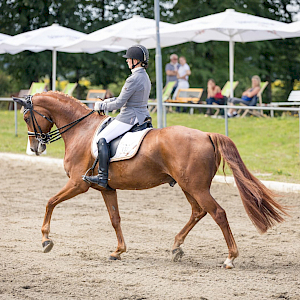 Bei sommerlichen Temperaturen ging es zu 13:20 Uhr ins Viereck: Spark of Life ertanzte sich eine WN 7,7 nach richterlicher Maßgabe bei Sommersgluthitze. Die beiden waren redlich fertig nach der super Leistung. Auch die anderen Starter gaben ihr Bestes – die Sonne war Zeuge, am Ende langte es jedoch bei keinem am Dancing-Fuchs vorbei – damit war den beiden fürs schweißtreibende Engagement die Goldmedaille in der Prüfung sicher. Platz1! Wir zollen Respekt für diesen enormen sportlichen Einsatz und gratulieren herzlichst.