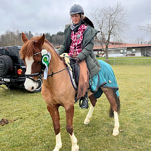 Es wird Sonntag, 16.3.2025, und in Ailingen startet früh morgens der Hänger-/Turnierpferdekonvoi Richtung Moosbeuren. Unsere Jugend hatte mit Trainerinnen Eva-Marie Brugger und Alisa Pickl fleissig trainiert und die Winterpause gut gemeistert - jetzt stand das erste Turnier auf der Agenda und los ging's! Schlechtes Wetter gibt's auch nicht - und so ließ sich auch niemand vom winterkalten Drizzelregen und Sturmböen-Draußen-Ambiente abhalten: gut angelandet wurde direkt gerichtet und warm geritten. Unsere jugendlichen Amazonen waren direkt erfolgreich und nahmen die Schleifen und Siegerehrungen gerne mit!