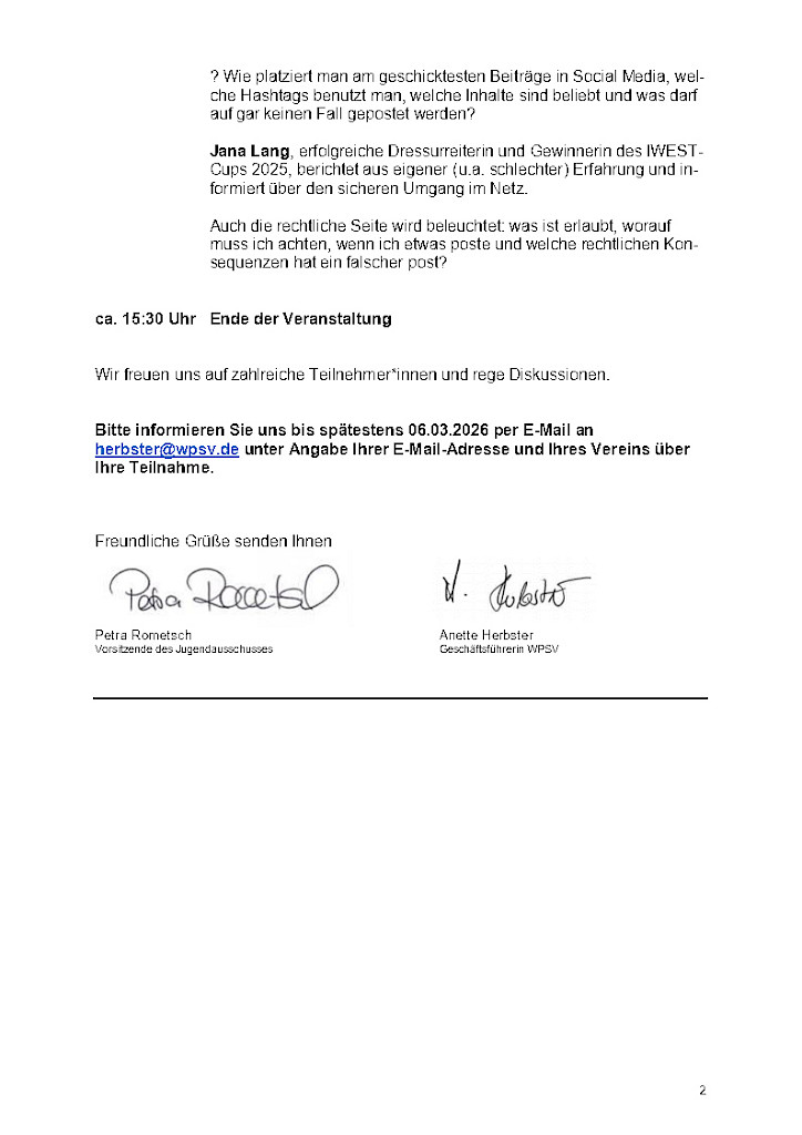 Herzliche Grüße Petra Rometsch – Vorsitzende des Jugendausschusses Anette Herbster – Geschäftsführerin WPSV
